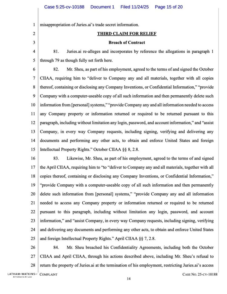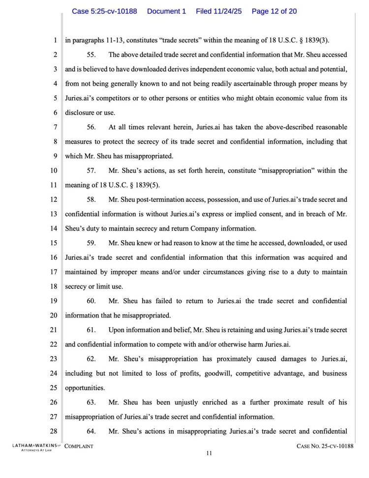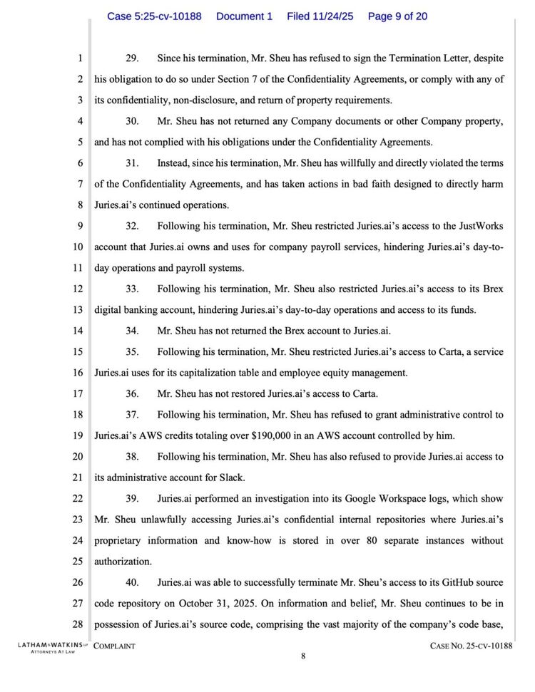 诉状显示,Vincent Sheu拒绝归还公司机密信息,干扰公司专利申请,并接触Juries.ai投资者以推销"实质性相同"的平台。Juries.ai请求法院颁布禁令,禁止许滥用其商业秘密,并索赔未具体说明的金额赔偿。