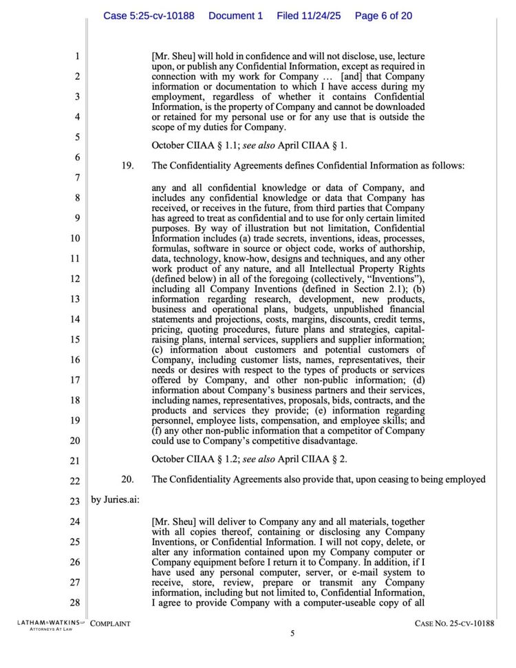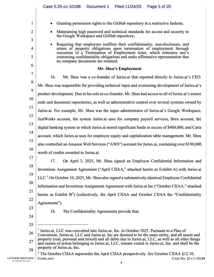 诉讼称这家初创公司于10月解雇了Vincent Sheu,并指出"尽管Vincent Sheu自称是能够构建Juries.ai平台的AI专家,但他对Juries.ai产品的推进并未作出实质性贡献"。