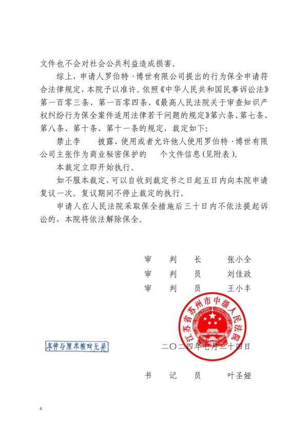 苏州中院收到申请后立即组成合议庭进行了审理,在一个工作日内即完成立案、听证、证据审查,并依法作出保全裁定,责令被申请人李某不得披露、使用或者允许他人使用博世公司主张作为商业秘密保护的文件信息。