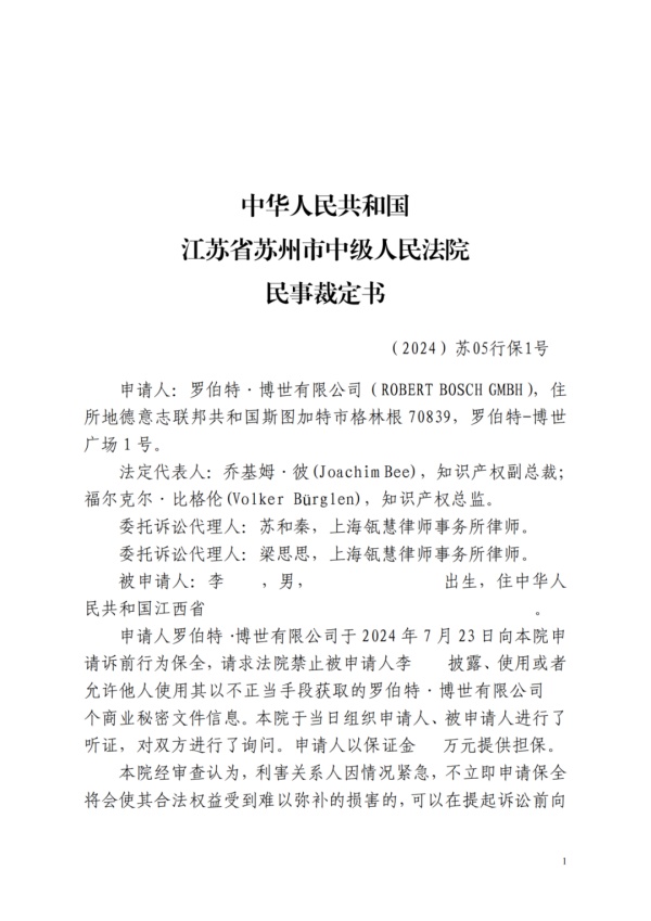 博世公司是一家在全球汽车技术领域享有盛誉的全球五百强公司,因其技术秘密文件可能遭到泄露,向苏州中院提出诉前行为保全申请。据了解,博世公司在汽车技术领域拥有众多核心技术,其技术秘密文件包含了公司具有核心竞争力的汽车技术,一旦泄露,将对公司的商业利益造成重大损害。