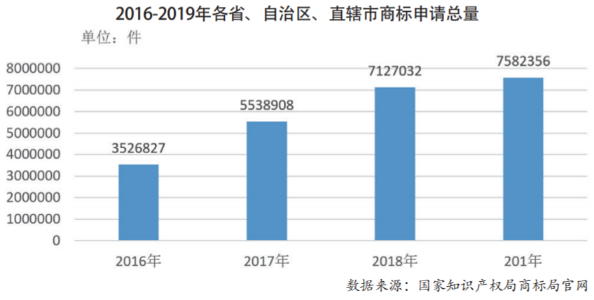 根据国家知识产权局数据显示,2019年,我国商标申请量为7582356件,商标注册量为6177791万件。截至2019年12月15日,我国有效注册商标量23543513件,同比增长23.34%。