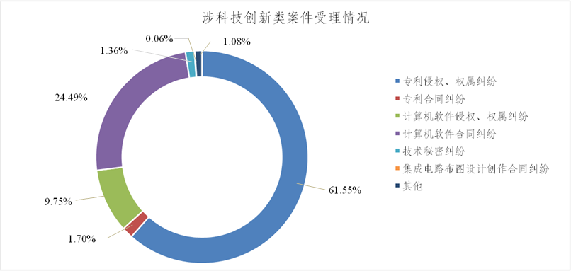 在受理的一审案件中,专利、计算机软件、技术秘密、集成电路布图设计纠纷等技术类案件共4994件,占一审案件数的97.29%,这些案件大多涉及软件开发、技术研发、成果转移以及产业化等科技创新中的利益分配、成果归属、权益保护等问题。(见图3)