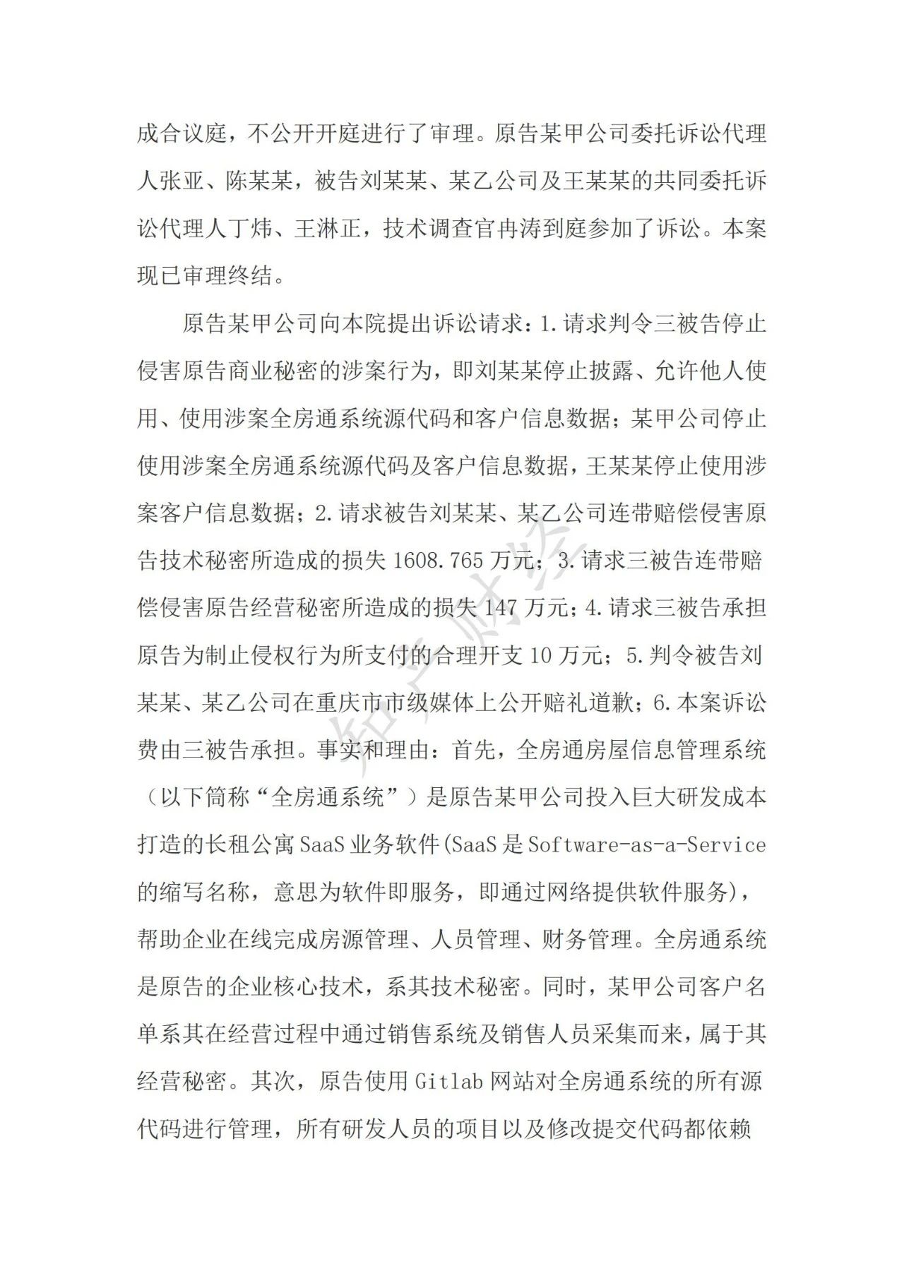 重庆甲科技公司研发的租房管理系统“全房通房屋信息管理系统”(简称全房通系统)源代码及开发的客户名单构成其商业秘密。刘某某曾系重庆甲科技公司法定代表人,其在离职前通过技术人员宋某获取上述全房通系统的源代码。王某某曾系重庆甲科技公司的行政人员,管理客户名单。刘某某离职后成立了重庆乙科技公司,王某某和宋某离职后亦入职重庆乙科技公司。经调查,在刘某某办公电脑、重庆乙科技公司网站等处查获重庆乙科技公司的“趣房通房屋信息管理系统软件”的源代码与重庆甲科技公司主张的全房通系统中的秘点具有同一性,同时查获了重庆甲科技公司的客户信息。