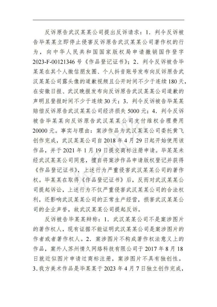 毕某梅与其子主要经营渔具店与蚯蚓养殖场。毕某梅将作品“图片”申请著作权登记,并于2023年6月19日获得登记,《作品登记证书》载明作者与著作权人均是毕某梅,创作完成日期为2023年4月7日,未发表。2023年10月10日,毕某梅与其子在武汉某某公司抖音店铺购买了使用涉案图形的鱼竿、鱼漂、饵盆等产品,毕某梅认为武汉某某公司未经许可使用涉案图形,侵犯其著作权,为此诉请判令:武汉某某公司停止侵权、赔礼道歉、消除影响。武汉某某公司认为毕某梅不仅侵犯其著作权,还恶意提起侵权诉讼,遂提起反诉请求判令:毕某梅停止侵权、赔礼道歉并赔偿损失及合理开支25000元。