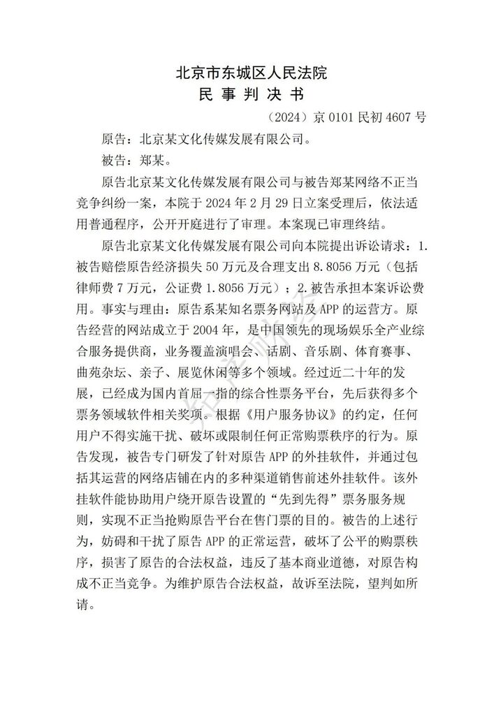 北京市东城区人民法院一审认为,郑某忠为北京大某文化传媒发展有限公司用户提供抢票服务,以北京大某文化传媒发展有限公司的经营活动和用户群体作为自身经营的基础资源,故被诉行为属于市场竞争行为,属于反不正当竞争法调整和规范的范畴。被诉行为实质是由软件代替人工方式为用户抢购大某平台的演出门票,该行为不仅直接增加了平台的运营成本,干扰经营者做出正确的经营决策,而且增加用户使用大某平台购票的难度,降低用户对大某平台提供服务的评价。虽然被诉行为未直接减损大某平台单场演出的售票收益,但导致大某平台的经营利益和商誉受损,损害了北京大某文化传媒发展有限公司的竞争利益。同时,被诉行为不属于技术创新的公平竞争,亦损害了消费者的合法权益和长远利益,不利于公平有序的市场竞争秩序及整体社会福祉的提升。综上,被诉行为构成不正当竞争。鉴于被诉行为已经停止,故不再另行判决停止侵权,判决郑某忠赔偿北京大某文化传媒发展有限公司经济损失及合理开支共计2万元。一审判决后,双方当事人均未上诉。