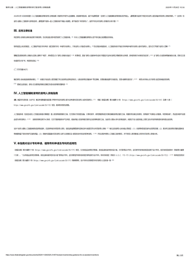 知产财经从Reuters获悉,2025年11月26日,美国专利商标局(USPTO)发布最新指南,明确规定:即便发明过程中运用了生成式人工智能(AI)系统,AI仅应被认定为辅助工具(类同实验室设备、软件、数据库等),不得被列为发明人;合法发明人仅限于对发明构思作出实质性贡献的主体,即自然人。