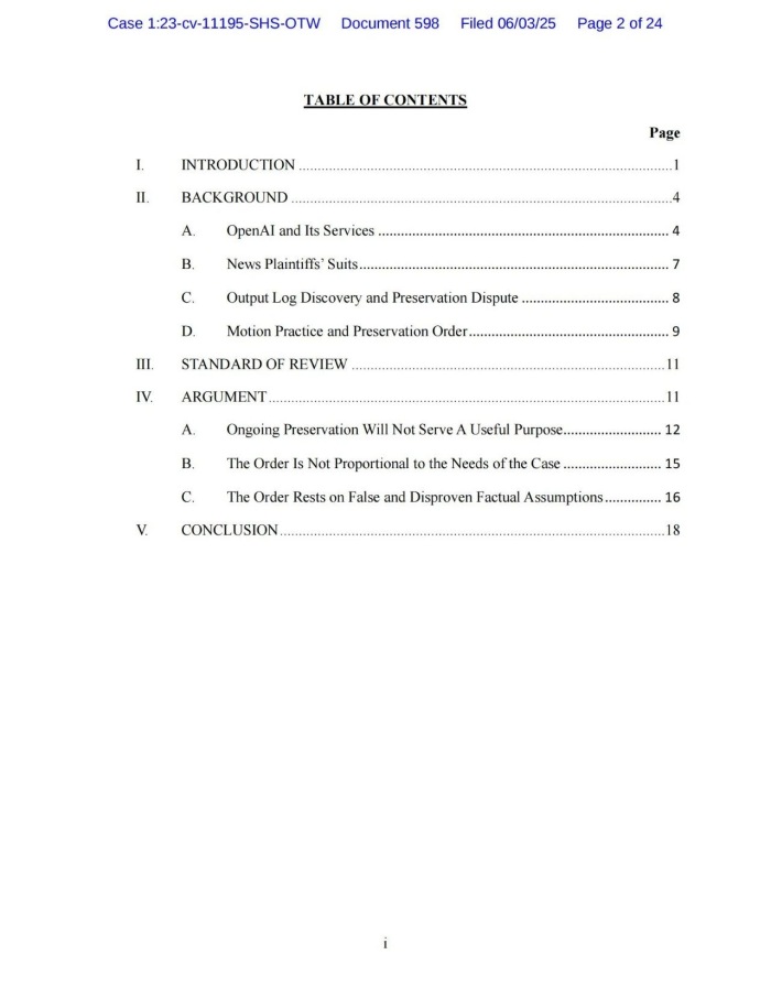 知产财经从海外媒体彭博社获悉,OpenAI向纽约联邦法院提交文件【《依据〈联邦民事诉讼规则〉第72(a)条就跨区诉讼ECF 33号保存令提出异议的法律备忘录》】,要求撤销治安法官Ona T. Wang此前签发的数据保存命令(保存并隔离所有输出日志数据)。该公司称该“范围广泛、前所未有”的命令威胁数亿用户隐私权,强制剥夺用户对ChatGPT对话数据的控制权。提交文件援引《纽约时报》观点称,美国人“应能掌控个人数据去向”。