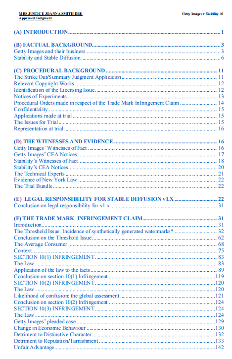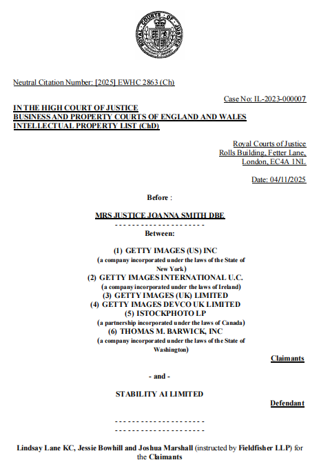 Joanna Smith法官裁定Getty在Stable Diffusion用户生成带有Getty水印的图像所涉及的商标侵权问题上取得"部分"胜诉,但强调其裁决结论"既具历史性,适用范围又极其有限"。
