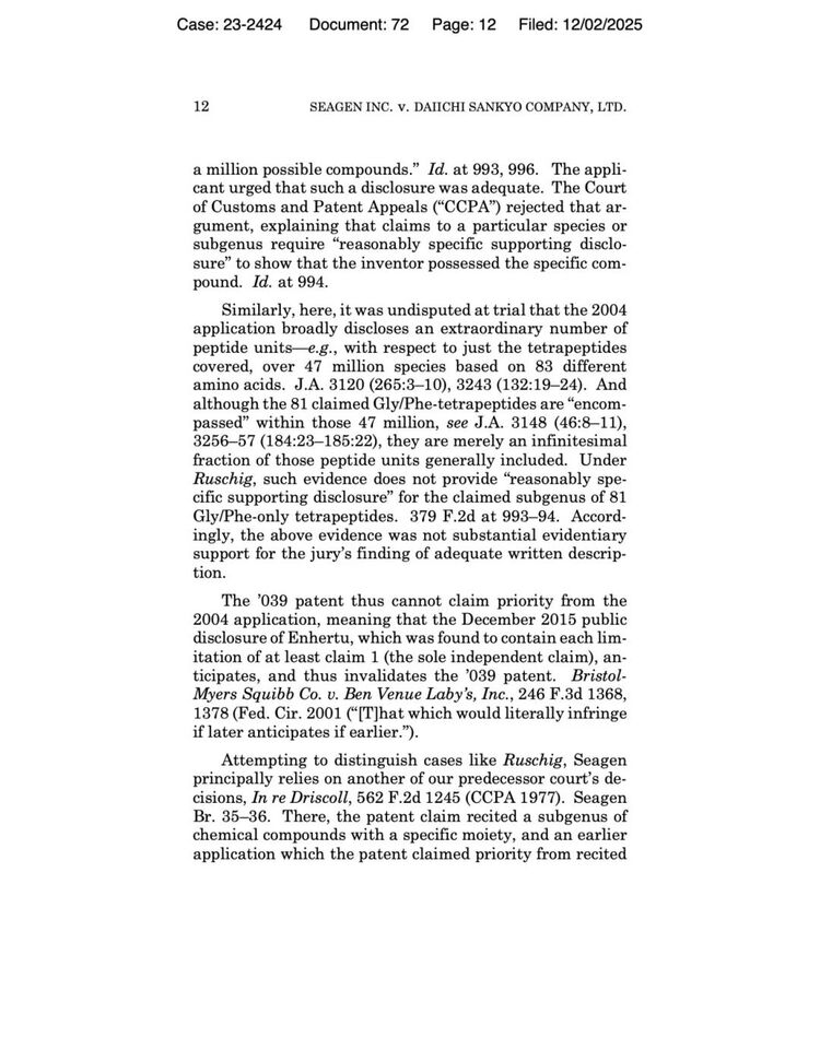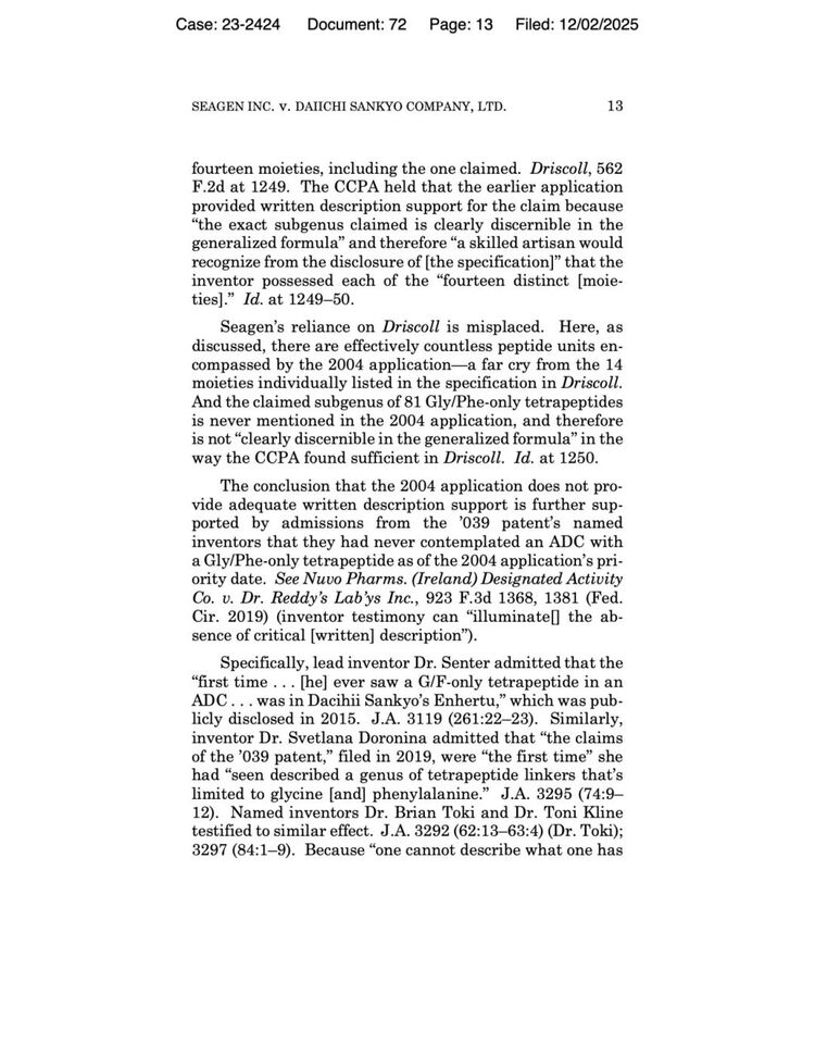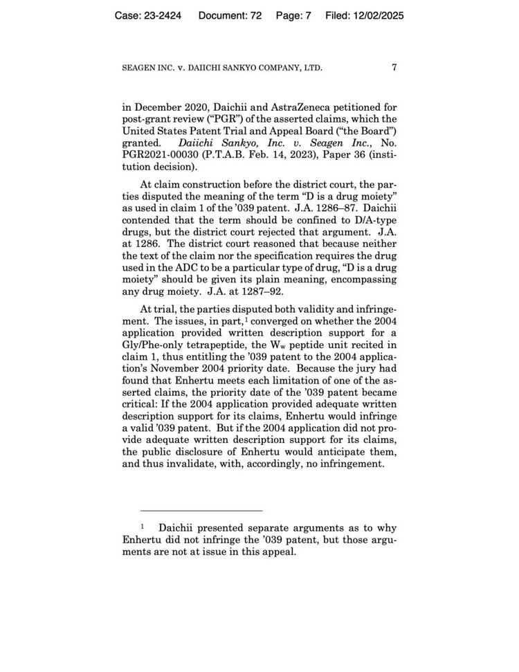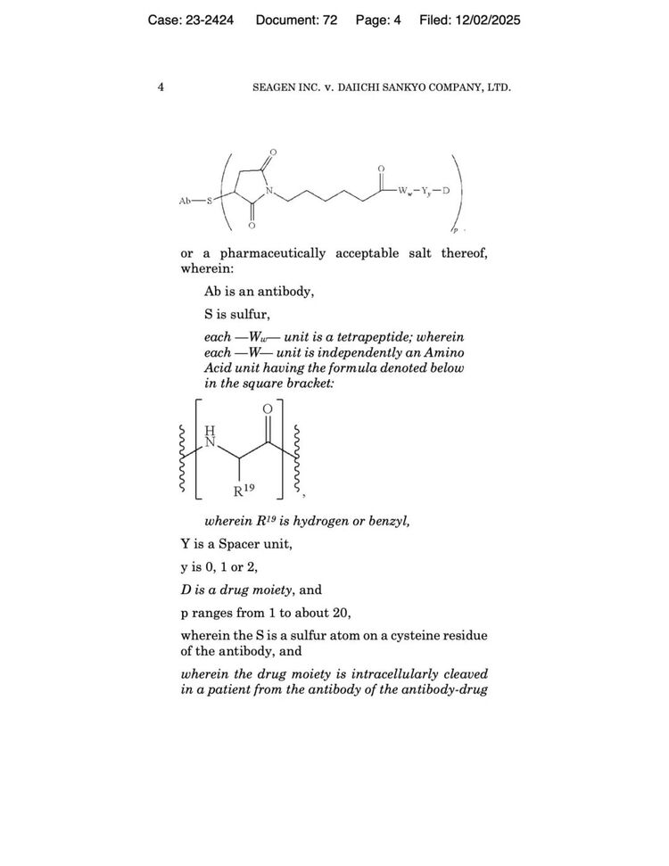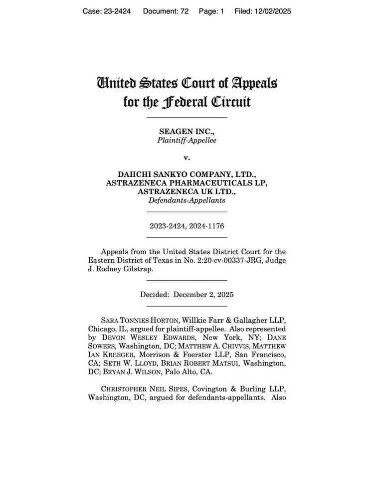 本案案号为"Seagen Inc诉第一三共株式会社",审理法院为美国联邦巡回上诉法院,案卷号23-2424。