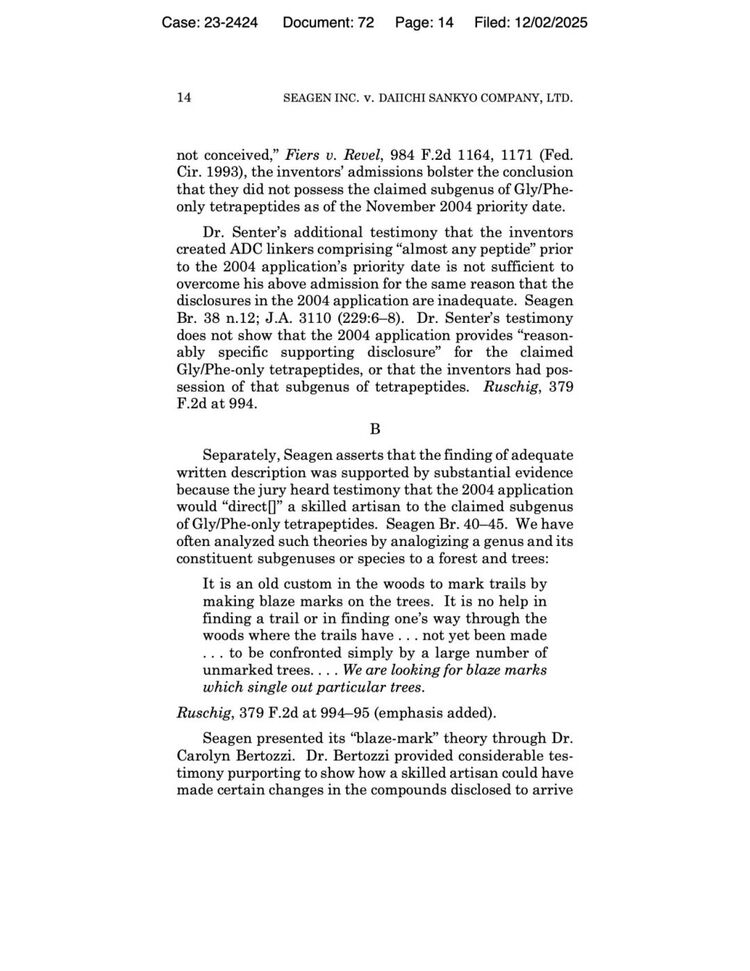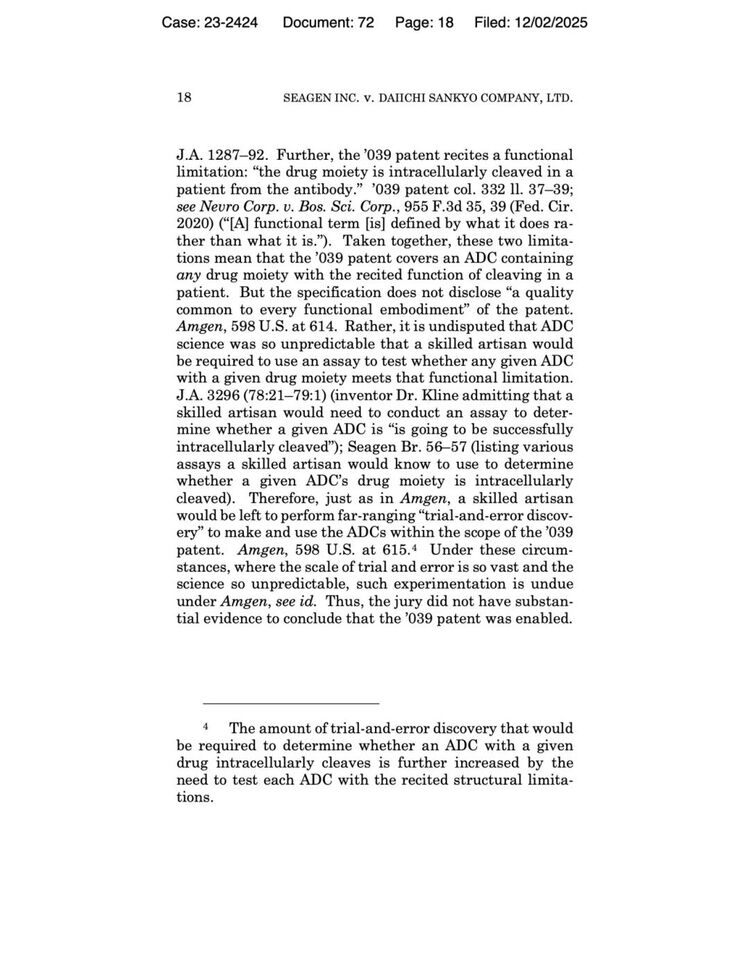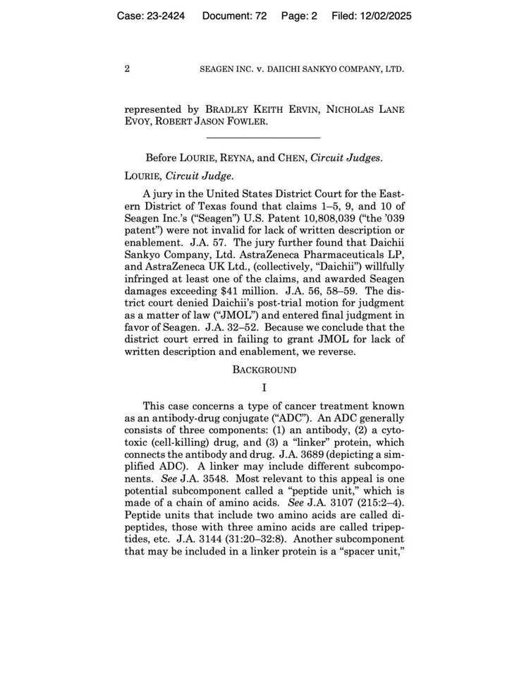 法院表示,Seagen专利因其未能充分说明所涵盖的抗体发明而无效,从而推翻了2022年德克萨斯州法院作出的侵权裁决。