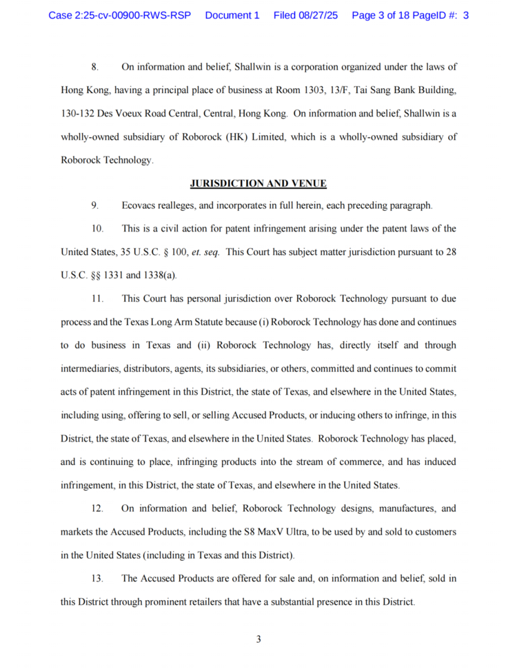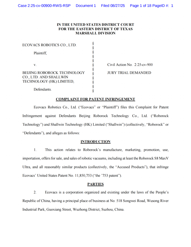 知产财经从海外媒体exparte获悉,2025年8月27日,科沃斯在美国德克萨斯东区联邦地区法院对石头科技及其子公司香港小文科技有限公司提起专利侵权诉讼,指控被告故意将侵权产品投入商业流通并预期其会被该地区消费者购买。(案件编号2:25-cv-00900)。