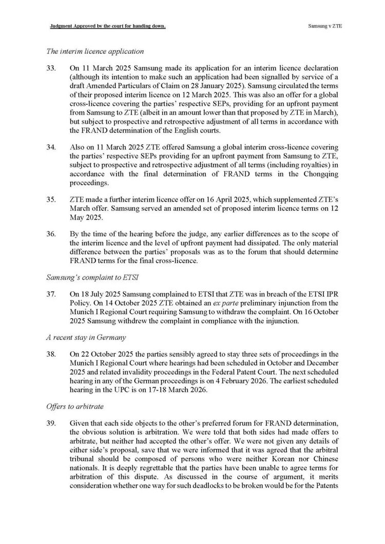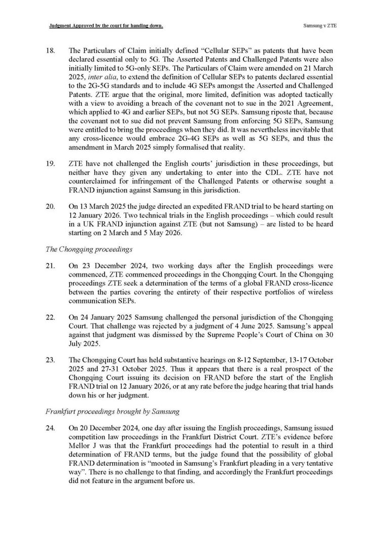 2024年12月19日,三星在英国提起诉讼,寻求FRAND费率裁定及专利侵权救济。