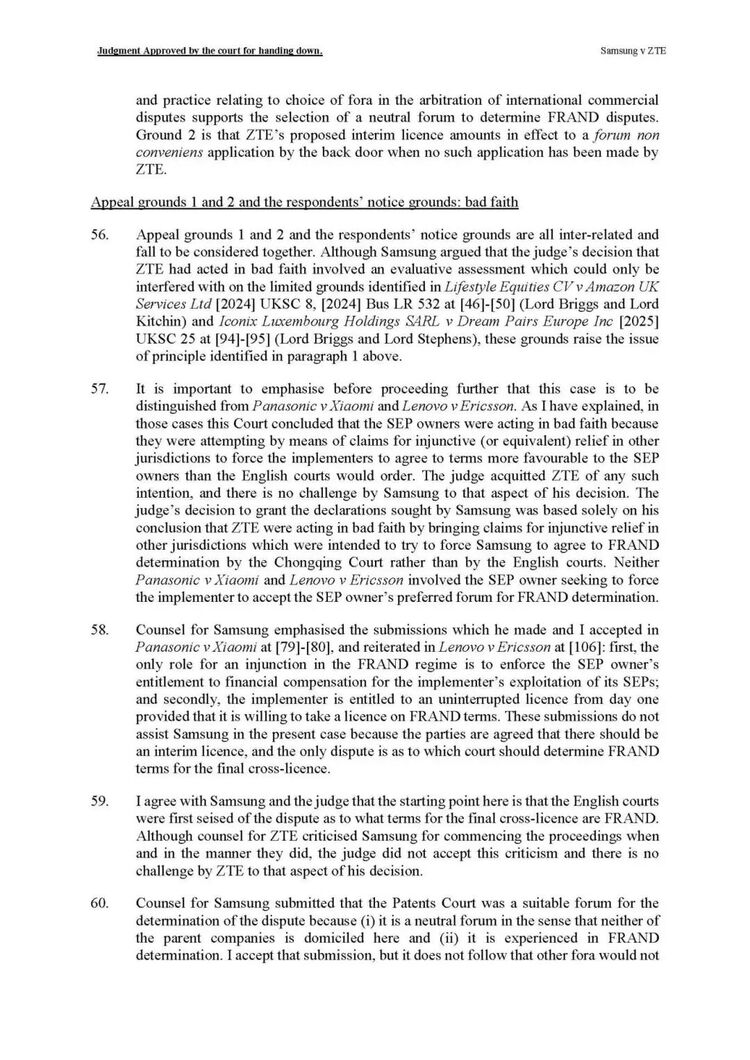 高等法院法官Mellor此前裁定,中兴通过在多国提起禁令诉讼,意图迫使三星接受重庆法院作为FRAND裁决地,构成“恶意”行为,并批准了三星提出的临时许可声明。