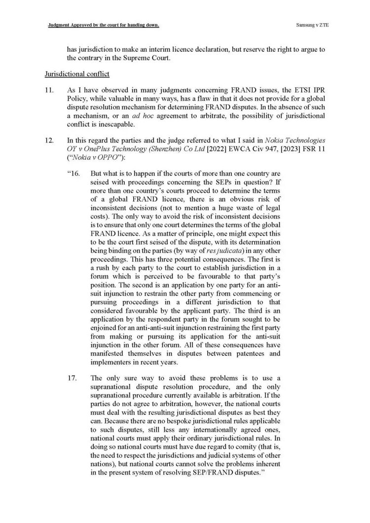 判决指出,本案与先前案例不同,并无证据表明中兴试图获取“超FRAND”的许可费率。同时,判决认为在缺乏全球统一FRAND争议解决机制的背景下,双方选择各自偏好的法院是固有现象,且三星未能证明重庆法院不适合或存在不公。