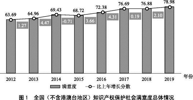2019年,中国知识产权保护得到创新主体、国际组织和各国媒 体广泛认可。知识产权保护社会满意度达到78.98分(百分制),较 2018年提升2.1分,权利人满意度升至新高,达到79.89分。世界 银行发布的《2020年营商环境报告》显示,中国营商环境总体得分 77.9分,较上一年上升4.26分;在全球的排名跃升至第31位,较 上一年提升15位。世界知识产权组织发布的《2019年全球创新指 数报告》显示,中国创新指数排名持续攀升至第14位,较上一年 提升3位,连续4年上升。中国欧盟商会发布的《商业信心调查2019》 报告显示,约六成企业认为中国知识产权行政与司法保护力度明显 加强。世界知识产权组织总干事弗朗西斯-高锐在日内瓦总部接受 央视记者釆访时,称赞中国在知识产权保护领域取得的巨大进步。 他表示,中国声音正在成为包括知识产权保护体系在内的全球政策 体系的重要声音。