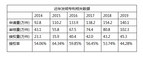 根据国知局官微发布的发明专利授权率计算方式,2019年发明专利授权率在44.28%,与2018年发明授权率53.47%相比,下降9.19个百分点。