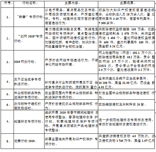 表1 2019年知识产权行政执法主要专项行动及成果汇总表