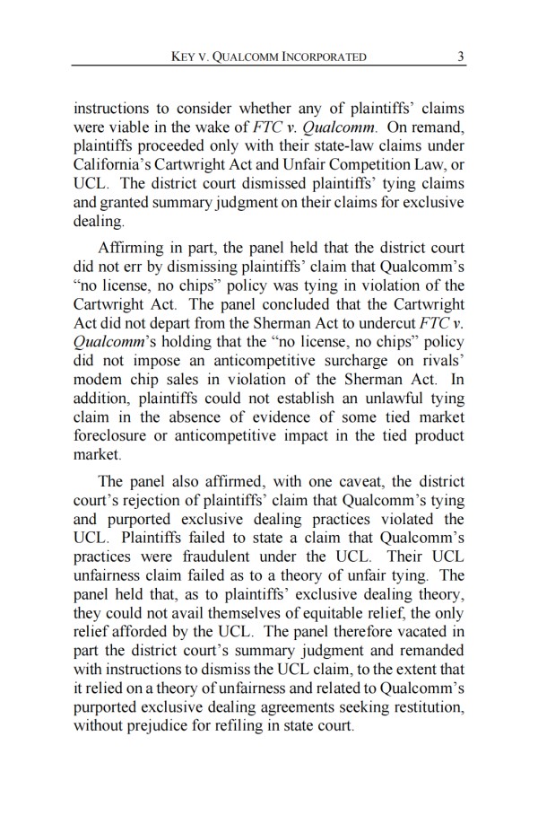 知产财经据JUSTIA(公正网)查询获悉,2025年2月25日,美国第九巡回上诉法院部分维持、部分撤销了地区法院的裁决(案号:No. 23-3354),认定高通的捆绑销售政策不构成反竞争行为,且原告(Sarah Key,Andrew Westley等)未能证明排他性交易导致实质性市场封锁或消费者损害。法院还撤销了地区法院对加州《不公平竞争法》(UCL)主张的简易判决,指示驳回该主张并允许原告在州法院重新起诉。