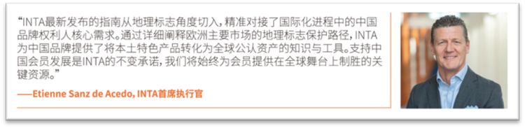 本指南由INTA地理标志委员会成员撰写并提供索引,并由INTA中国会员翻译并校对,内容兼具战略性与实操性,并将成为中国地理标志用户不可或缺的参考工具,助力中国企业将独特的地理标志转化为受全球市场认可的品牌资产,增强其国际影响力和核心竞争力。