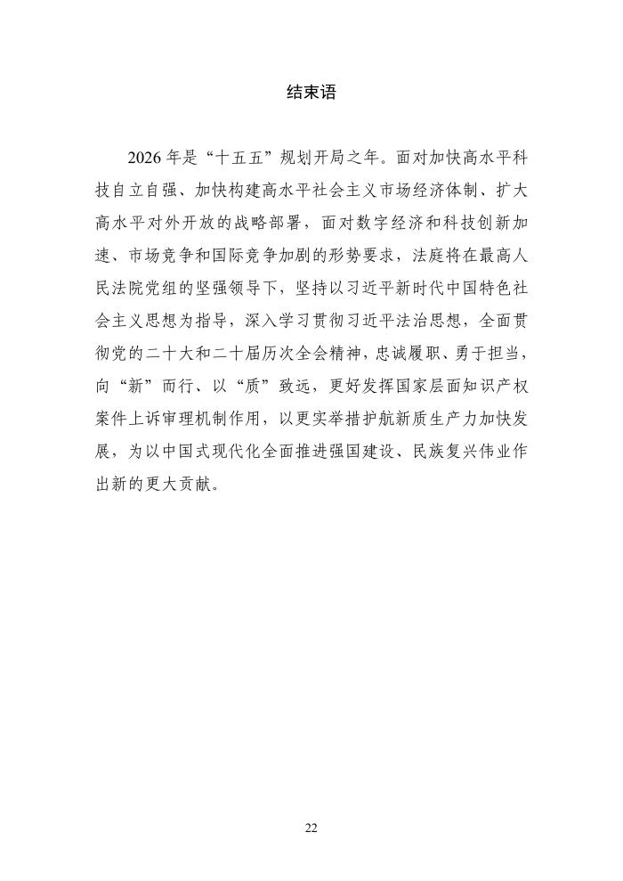 2025年是“十四五”规划收官之年,也是最高人民法院知识产权法庭改革试点的第七年。在最高人民法院党组的坚强领导下,法庭坚持以习近平新时代中国特色社会主义思想为指导,深入学习贯彻习近平法治思想,全面贯彻党的二十大和二十届历次全会精神,认真落实《中共中央关于加强新时代审判工作的意见》,积极发挥国家层面知识产权案件上诉审理机制作用,不断提升审判质效,以加强司法保护知识产权保障创新驱动发展战略实施,以强化司法反垄断服务构建全国统一大市场,为加快发展新质生产力提供有力的知识产权与公平竟争法治保障。现发布法庭2025年工作年度报告,以期增进社会各界对法庭工作的了解和监督。