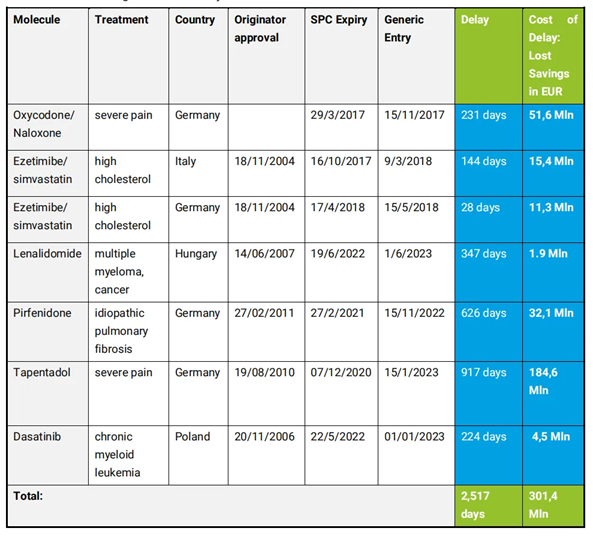 表1:报告中由于专利链接,仿制药推迟上市的部分药品清单