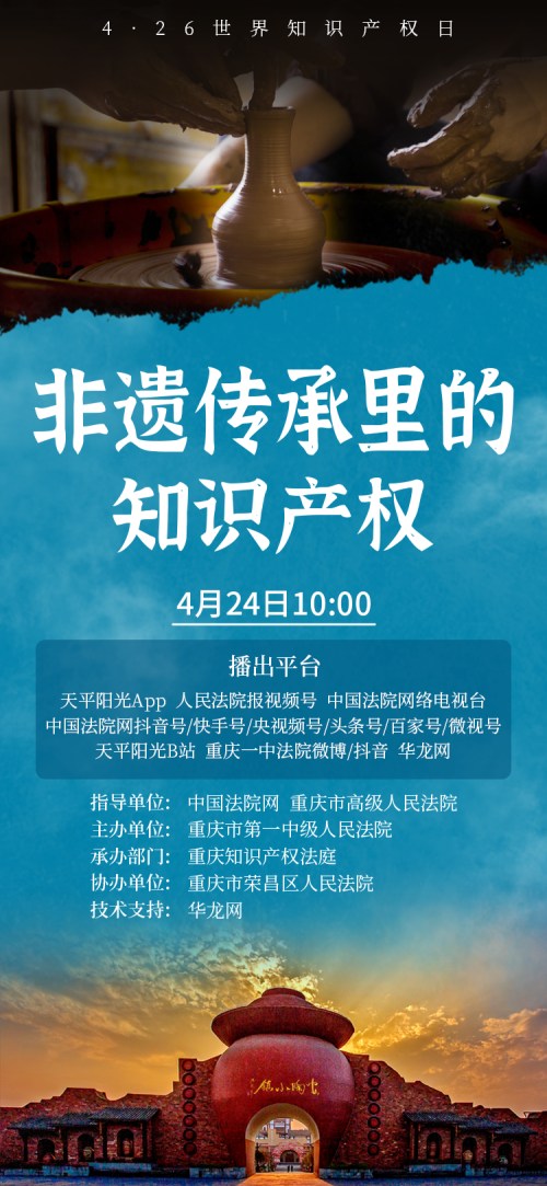 “4·26世界知识产权日”将至,4月24日上午10点,重庆市第一中级人民法院重庆知识产权法庭的趣味普法直播又将上线。本次直播将走进中国四大名陶之一——荣昌陶的发源地重庆荣昌,展示荣昌陶、夏布、折扇等国家级非遗瑰宝的魅力,让大家在邂逅千年文化的同时学到相关知识产权知识。