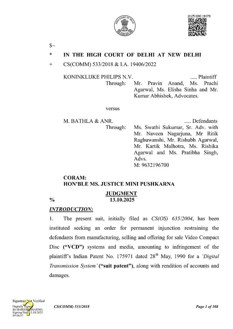 知产财经获悉,2025年10月13日,印度德里高等法院(Delhi High Court)就 Koninklijke Philips N.V.(荷兰皇家飞利浦公司)诉 M. BATHLA & ANR.(简称“Bathla公司”)专利侵权案作出判决,驳回飞利浦公司全部诉讼请求。法院认定,Bathla公司的VCD复制行为未侵犯飞利浦公司印度第175971号“数字传输系统”专利,飞利浦公司主张的200万印度卢比(约合18.6万元人民币)损害赔偿亦无事实及法律依据。